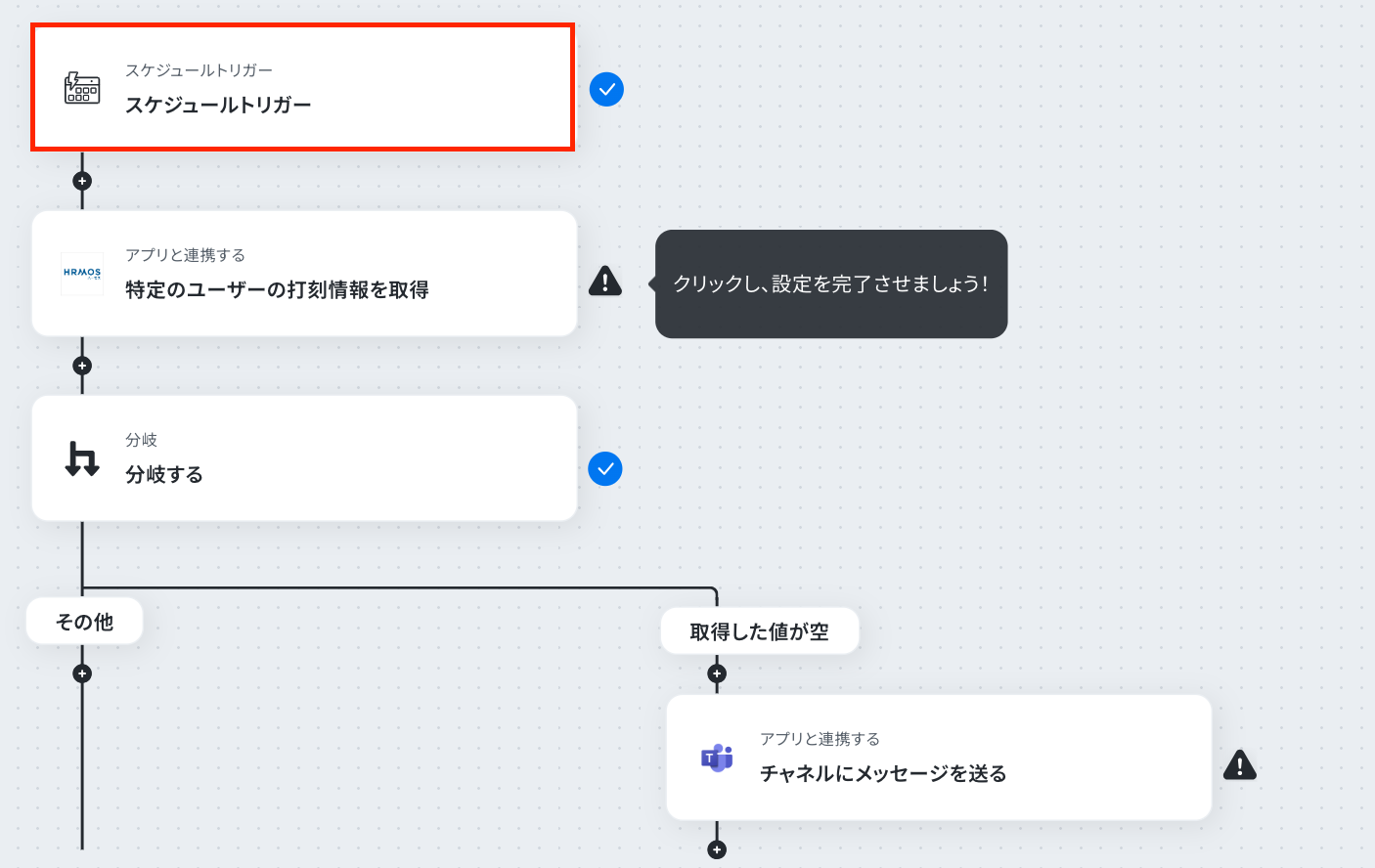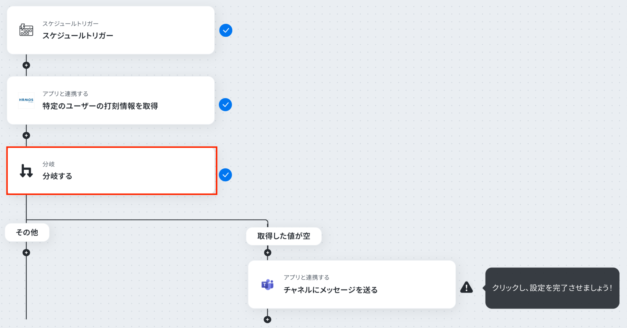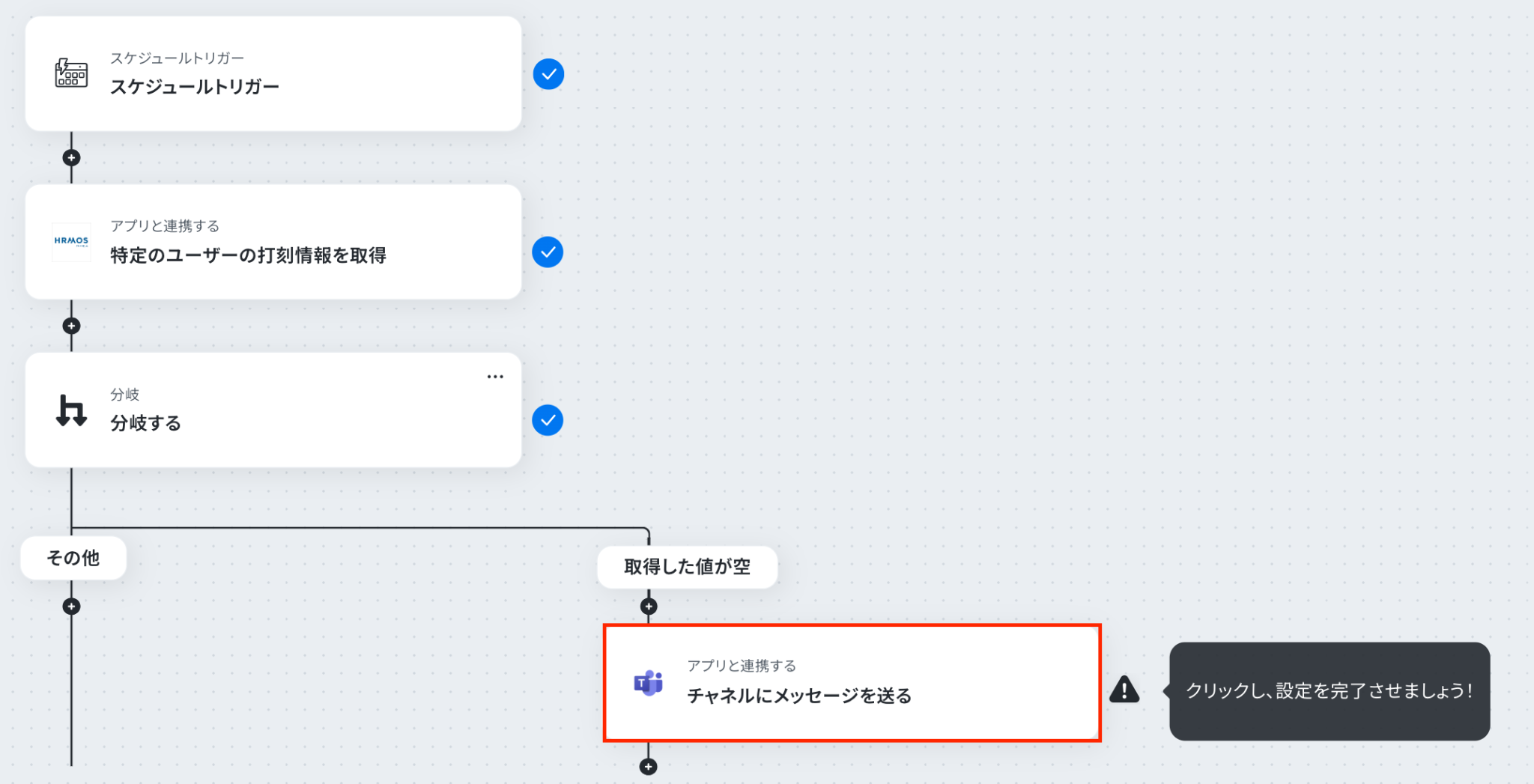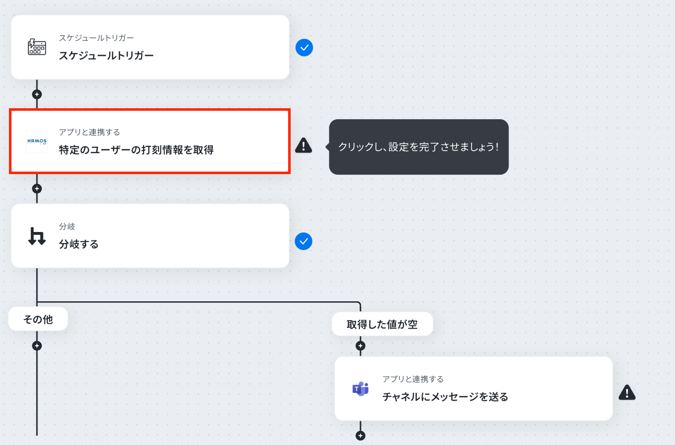 スケジュールトリガーでは、毎日、毎週など、フローを起動する頻度や時間を任意で設定してください 分岐機能では、HRMOS勤怠から取得した情報をもとに、「出勤打刻が存在しない場合」など、通知のきっかけとなる条件を自由に設定できます Microsoft Teamsへの通知設定では、メッセージを送るチームやチャネルを任意で指定し、本文に取得した従業員名などの情報を変数として含めることも可能です ■注意事項
