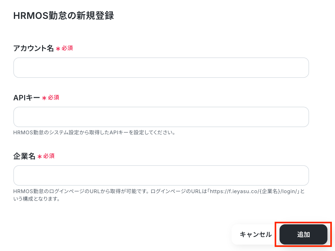 先ほどと同じ手順で進み、検索窓にHRMOS勤怠と入力し、選択します。 新規登録画面が表示されるので「アカウント名」・「APIキー」・「企業名」を入力して連携完了です! 入力する際は、入力欄下の注釈を参照してください。