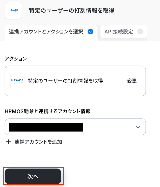 ステップ3:HRMOS勤怠のアクション設定 特定ユーザーの打刻情報を取得する設定をしていきます! まずは、赤枠部分をクリックしてください。