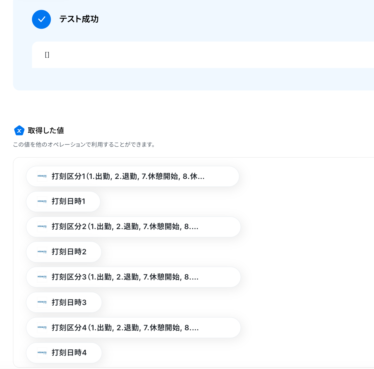 ※今回は、打刻漏れしていることを想定しているため、取得した値は空になります。※ 取得した値 とは? トリガーやオペレーション設定時に、「テスト」を実行して取得した値のことを指します。 後続のオペレーション設定時の値として利用でき、フローボットを起動する度に変動した値 になります。