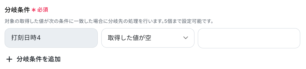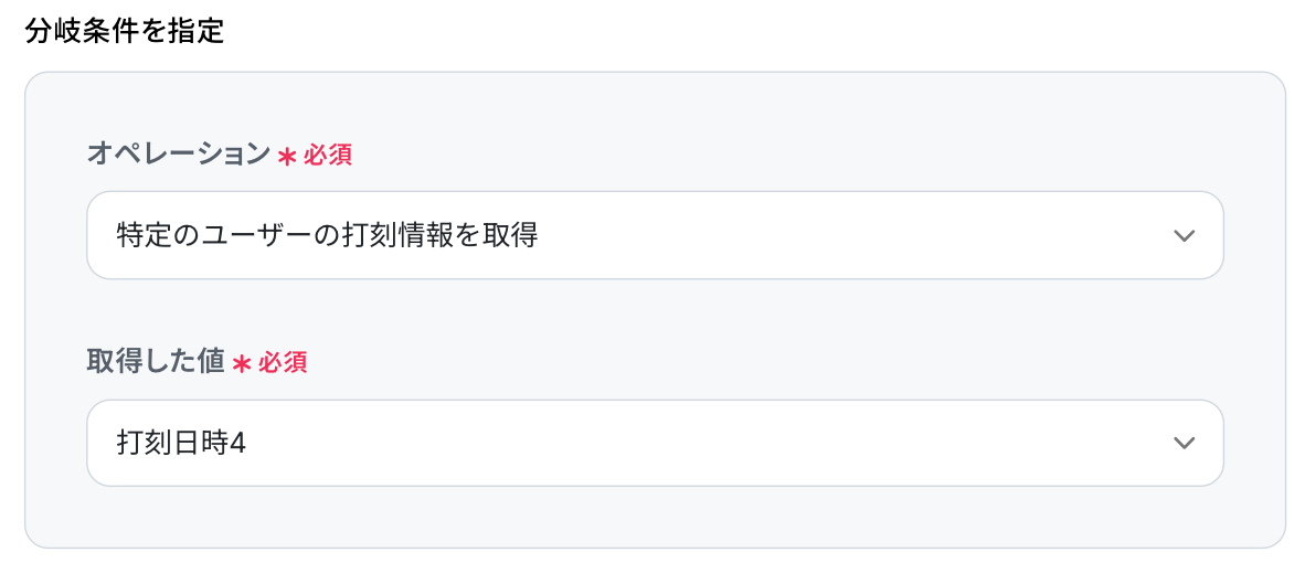 続いて、「分岐条件」 を設定します。 ここで指定した条件に合致した場合のみ、後続のオペレーションへ進むことになります。 ここでは、打刻漏れがあった場合に後続のオペレーションに進むよう、設定しました。