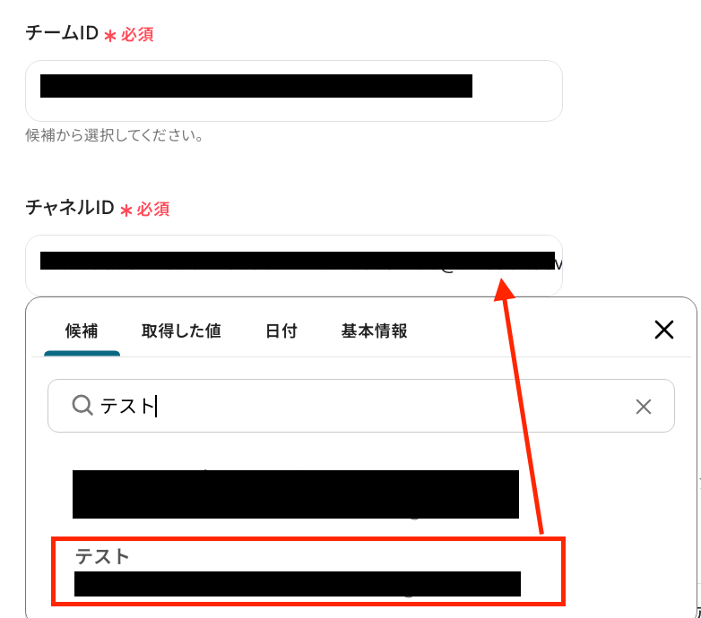 次の画面に遷移したら、必須項目を設定していきます! 「チームID」と「チャネルID」は、候補から選択してください。