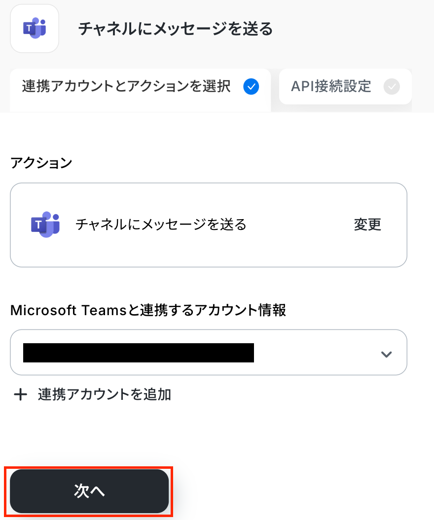 ステップ5:Microsoft Teamsのアクション設定 最後の設定です! ここでは、打刻漏れがあった場合に、Microsoft Teamsに通知するメッセージを設定していきます。 赤枠部分をクリックしましょう!