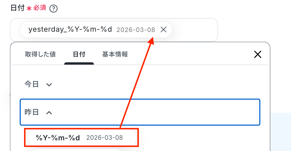 「日付」は、日付変数を使用して設定します。