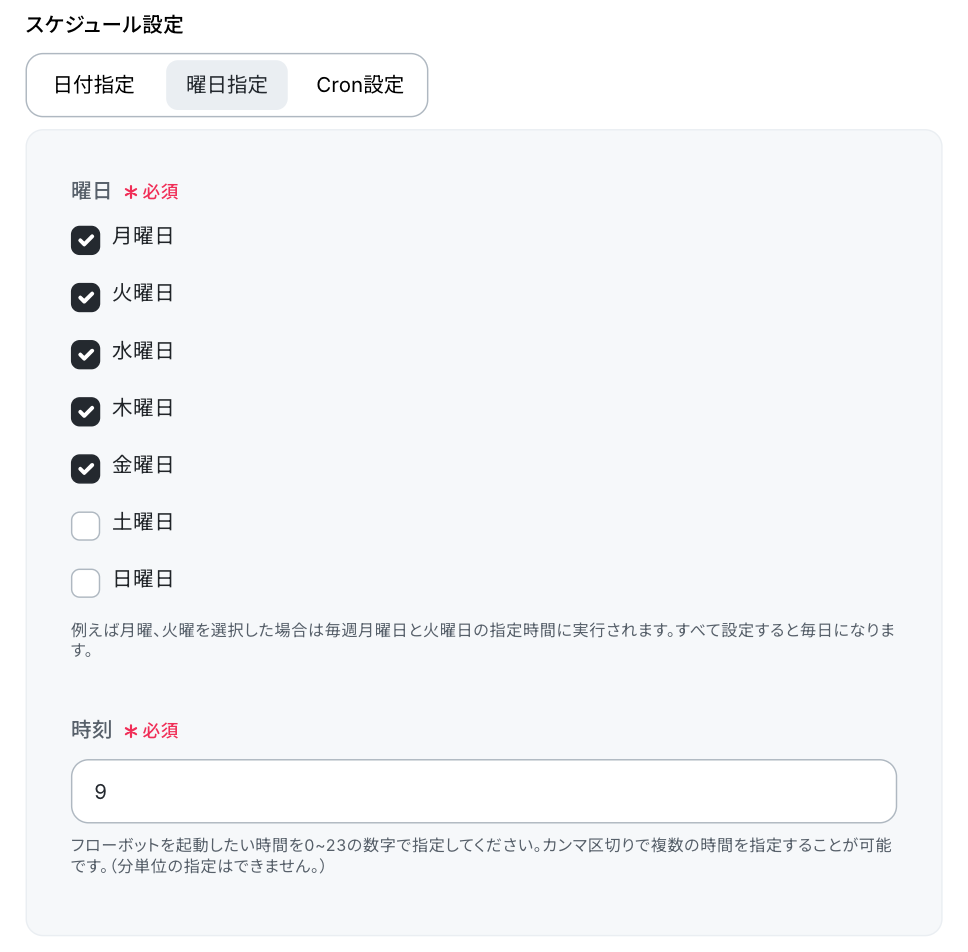 「スケジュール設定」では、フローボットを起動したい日付や時刻を設定します。 今回は以下の設定にしましたが、自由に設定してOKです。 設定を終えたら「完了」をクリックしましょう!