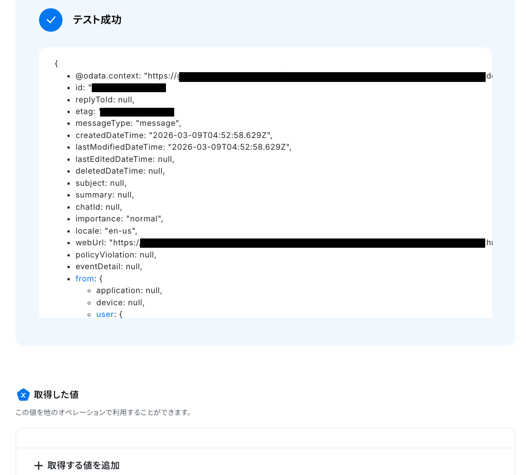 「テスト」をクリックします。 テストに成功すると、取得した値が表示されます。