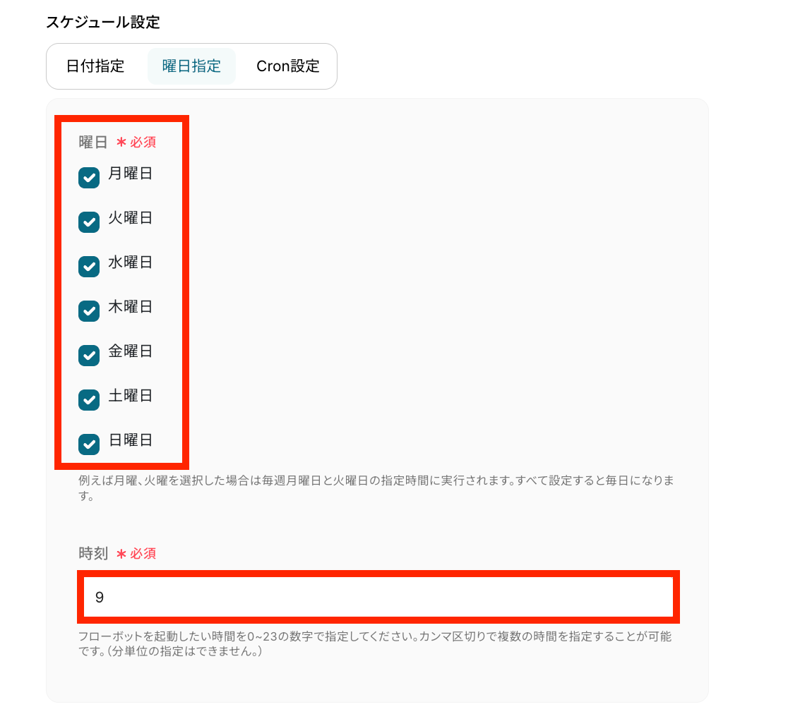 - スケジュールトリガーでは、フローを起動したい任意の時間(例:毎朝9時など)を設定してください。