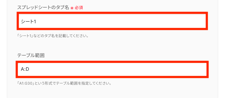 - Google スプレッドシートのオペレーションでは、書き込み対象としたい任意のスプレッドシートIDやシート名を設定してください。