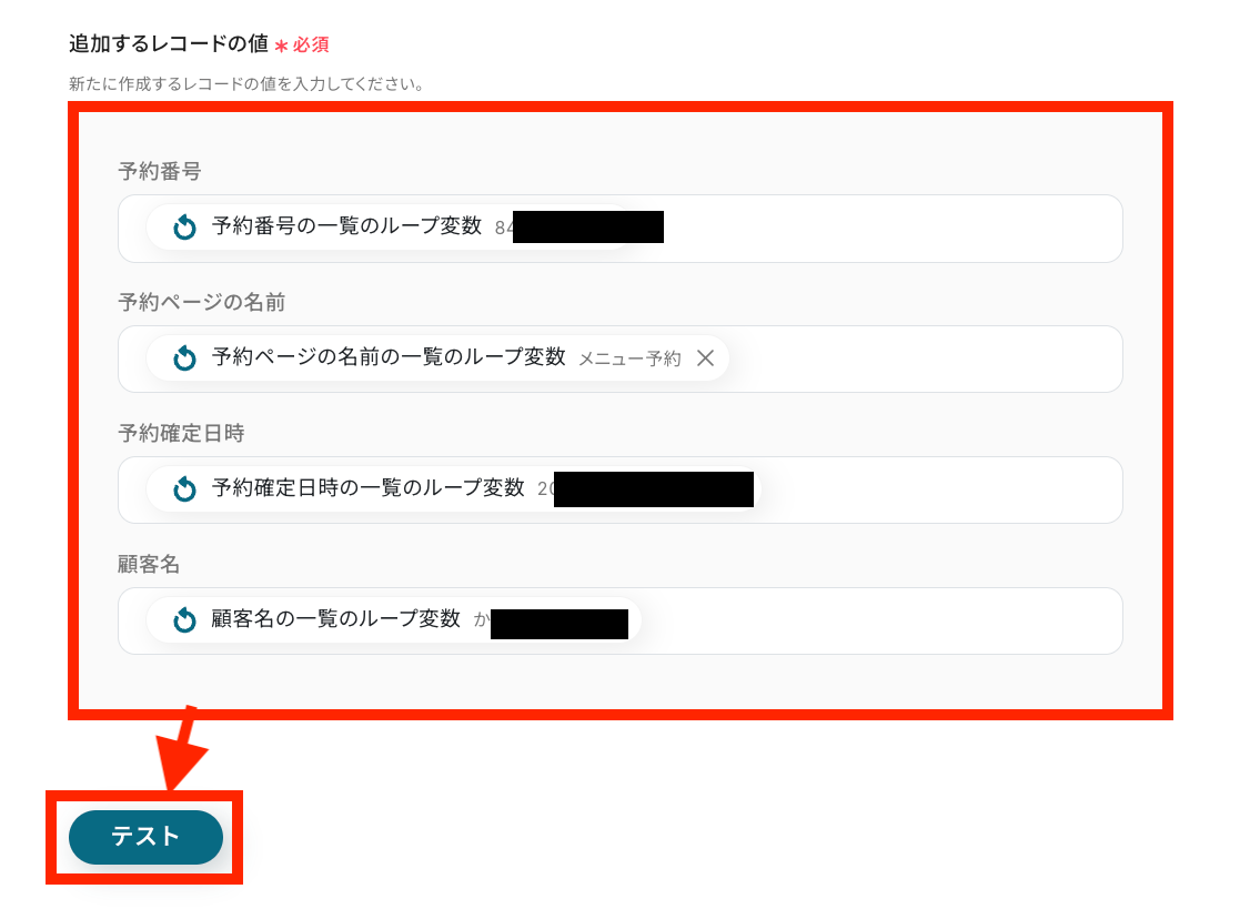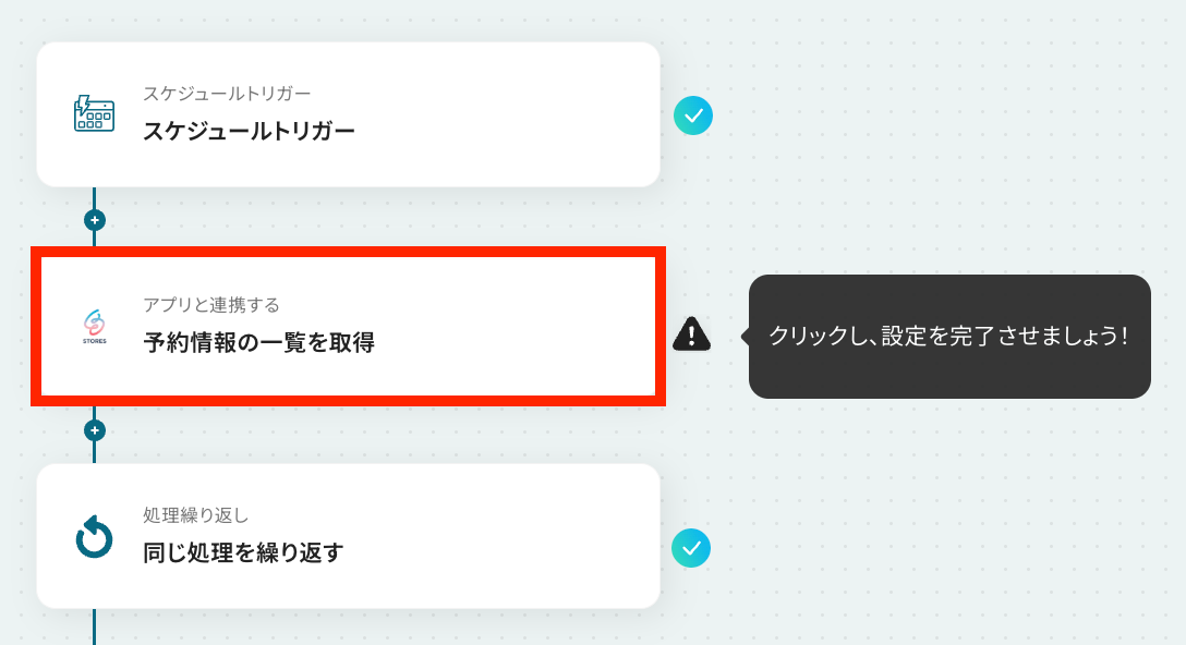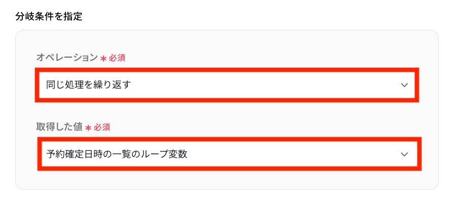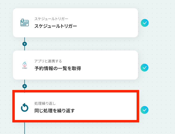 - 取得した複数の予約情報を1件ずつ処理するため、ループ機能で「同じ処理を繰り返す」アクションを設定します。