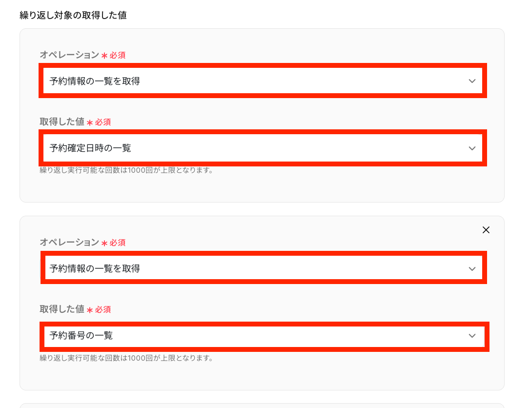 「繰り返し対象」として「予約情報の一覧を取得」を選択し、それぞれの項目を選択します。
