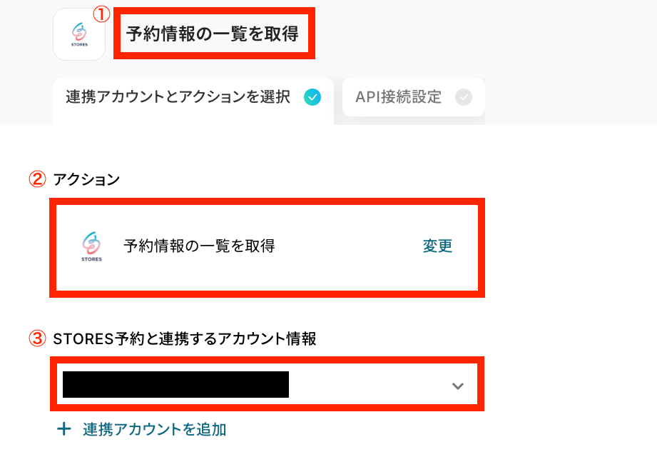 - 続いて、オペレーションでSTORES予約の「予約情報の一覧を取得」アクションを設定します。