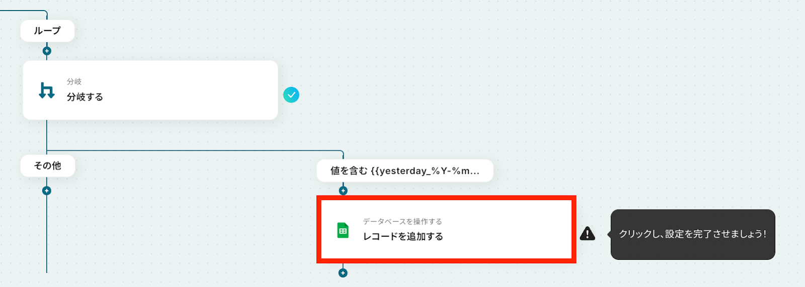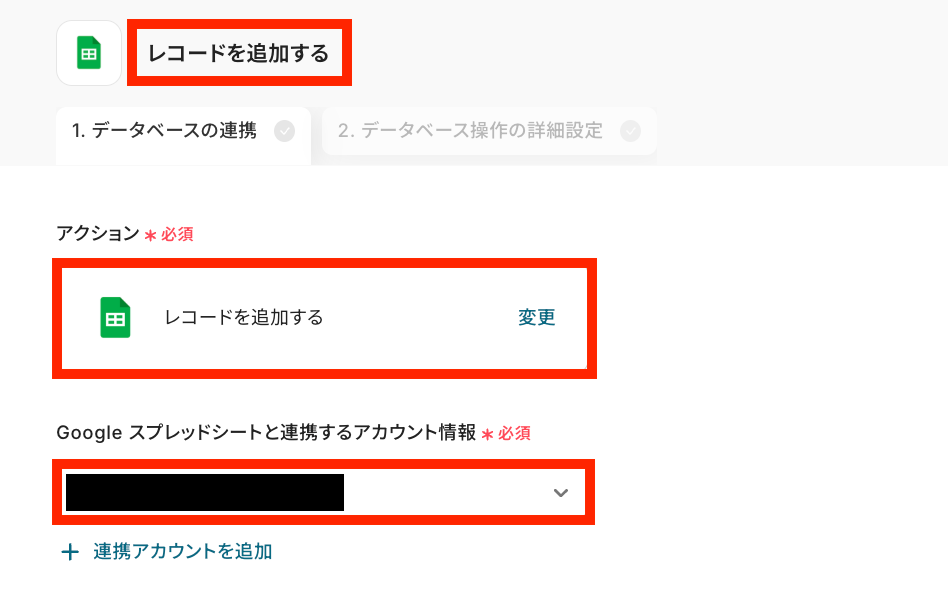 - 最後に、Google スプレッドシートの「レコードを追加する」アクションを設定し、指定のスプレッドシートに情報を追加します。