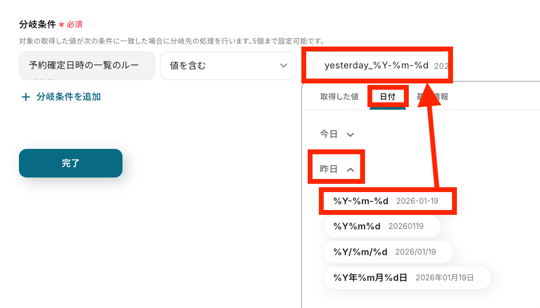 このステップでは、「昨日」予約確定した予約情報だけをピックアップします!
