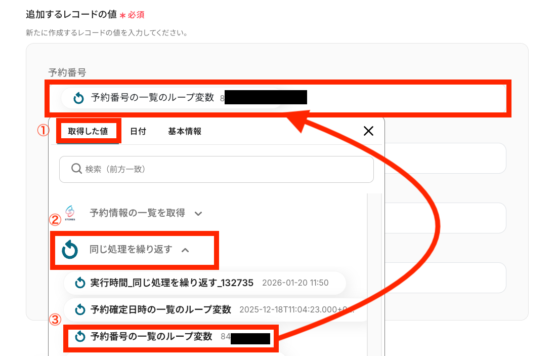 - ループ機能では、前段のSTORES予約で取得した予約情報の一覧など、繰り返し処理を行いたい値を設定してください。