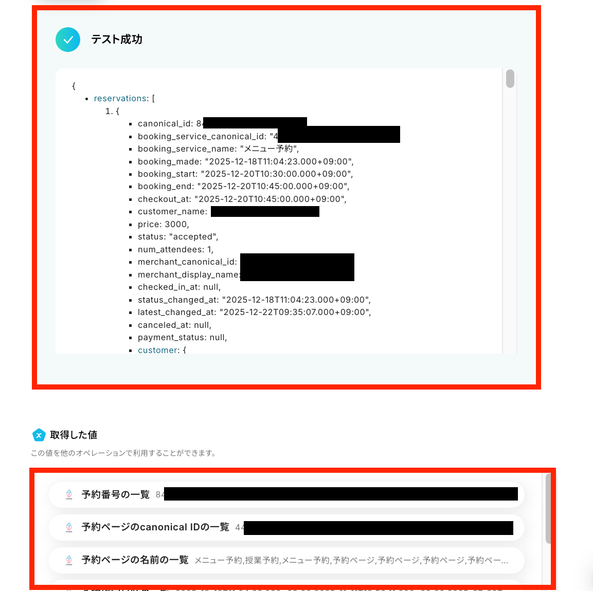 テストに成功すると、STORES予約の指定した条件に合致するデータが反映されます。