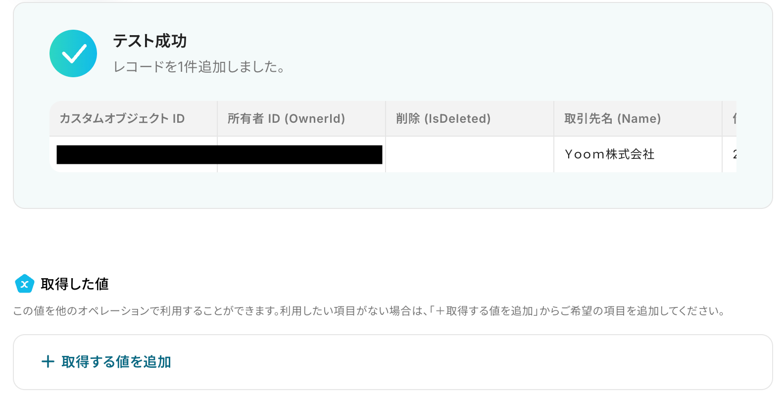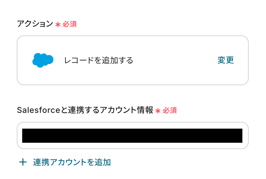 - 次に、オペレーションで、Salesforceの「レコードを追加する」アクションを設定し、取得した法人情報を取引先オブジェクトの各項目にマッピングします。