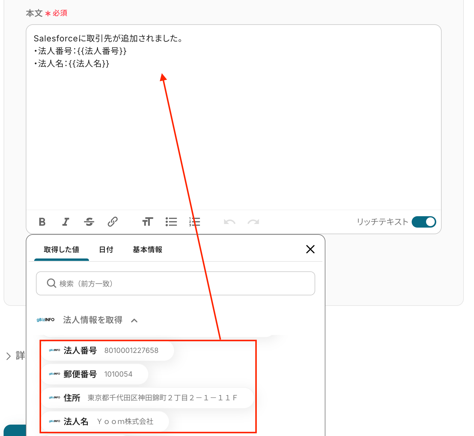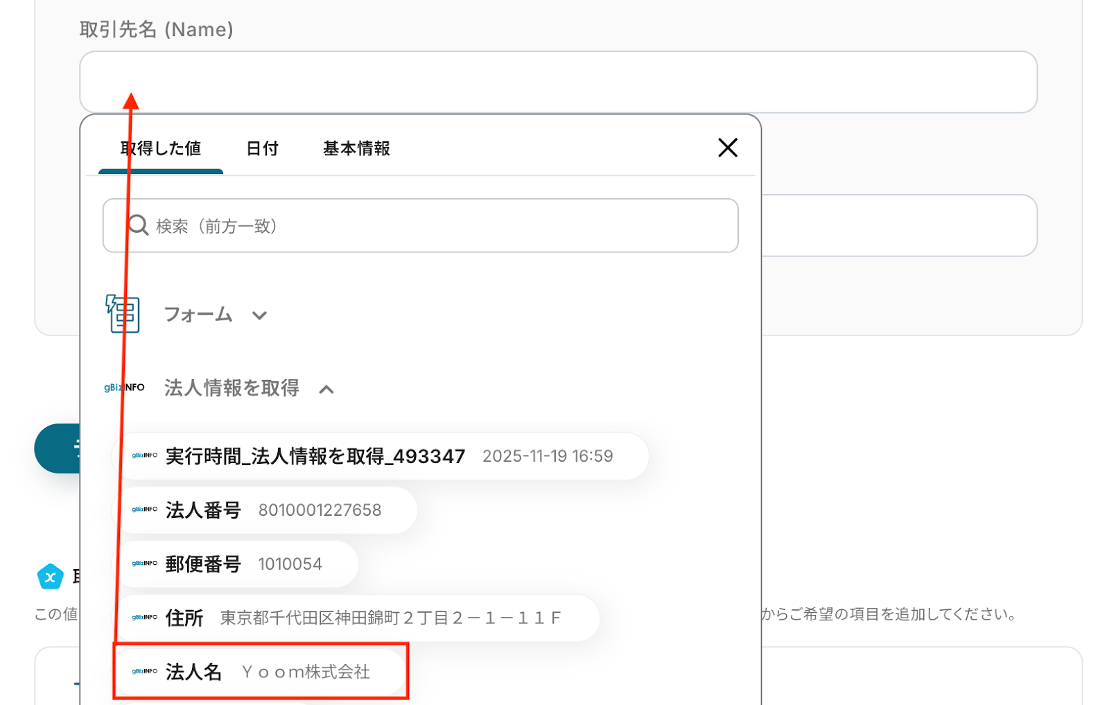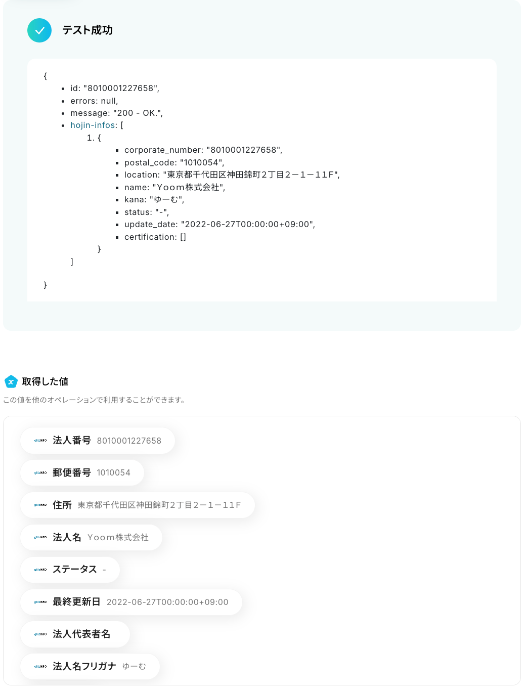 ここで入力した値(=取得した値)を利用して、この後のステップでgbizINFO(経済産業省)で法人情報を取得できます。