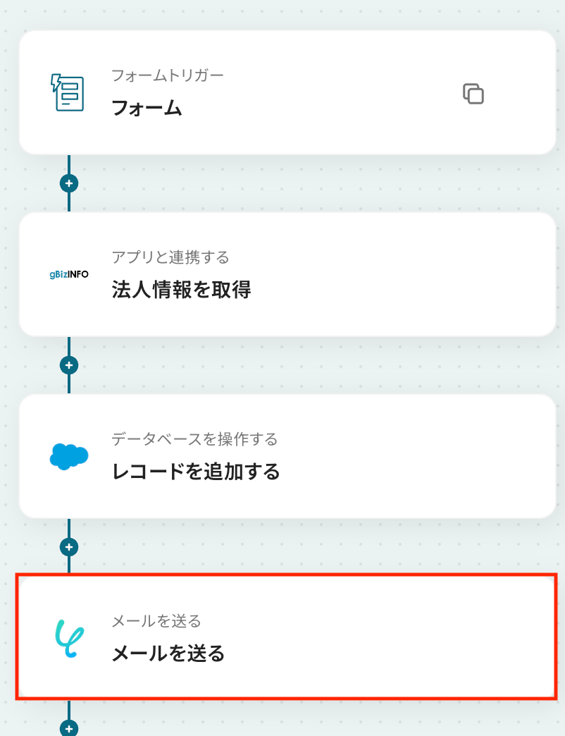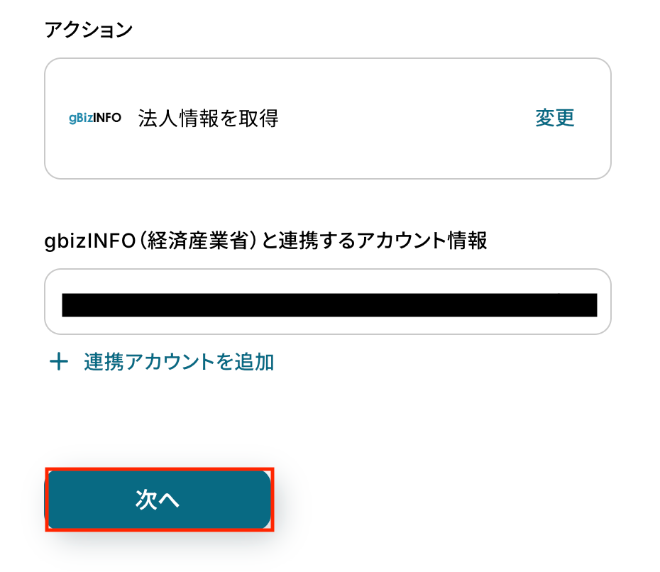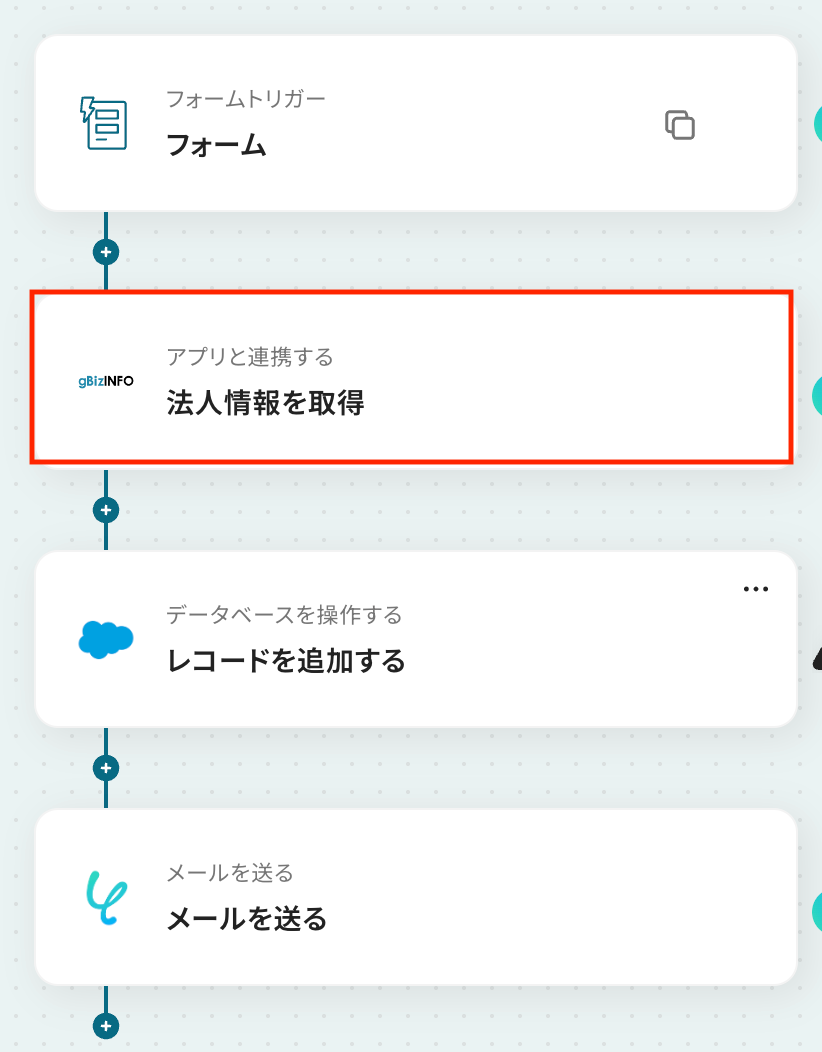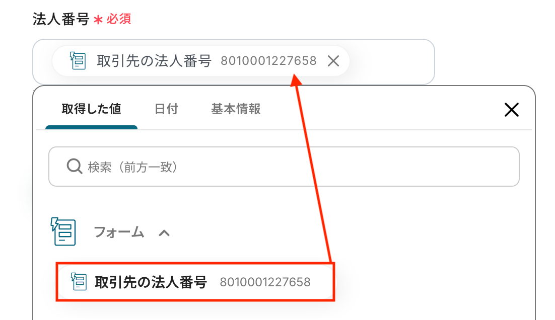 ここで入力した値(=取得した値)を利用して、この後のステップでgbizINFO(経済産業省)で法人情報を取得できます。