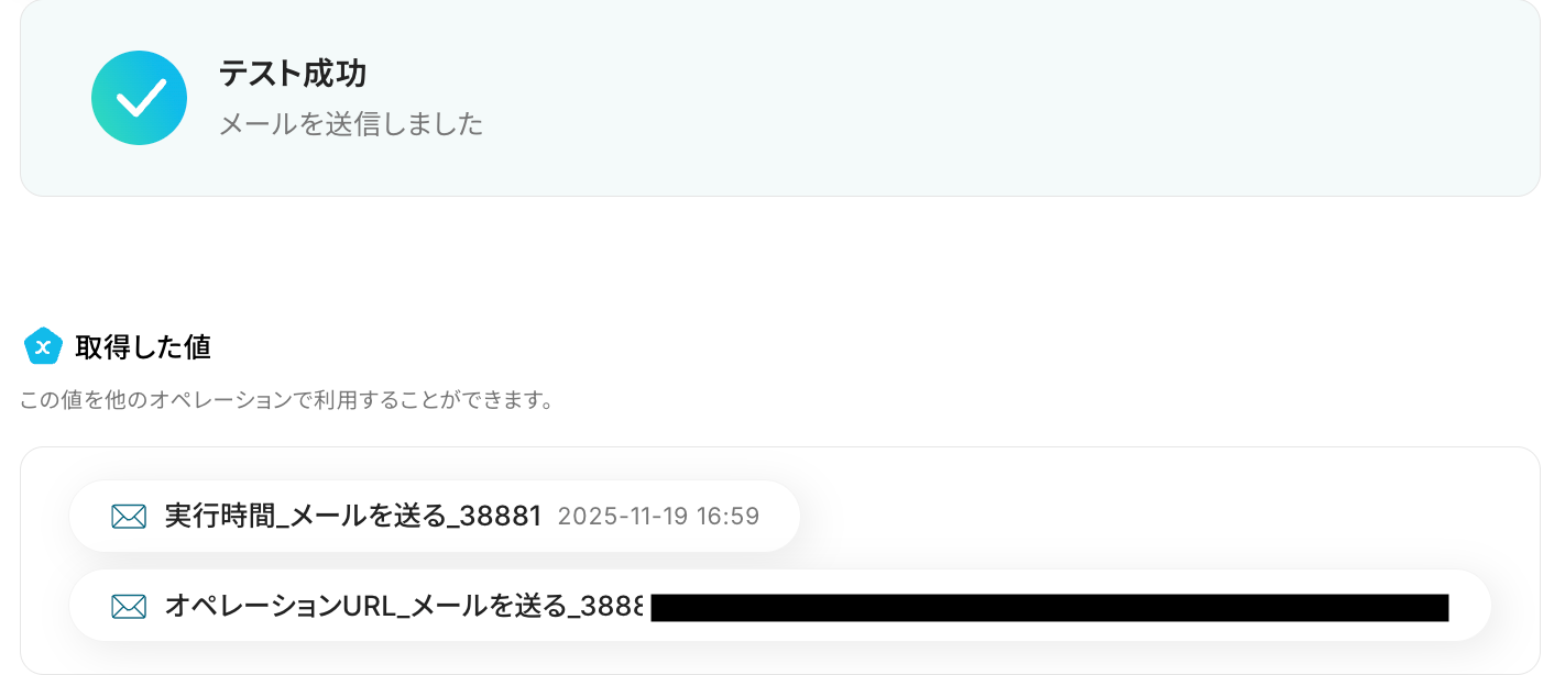 - メール機能では、通知先のメールアドレスや件名、本文を任意で設定でき、本文には前段で取得した情報を変数として利用することも可能です。