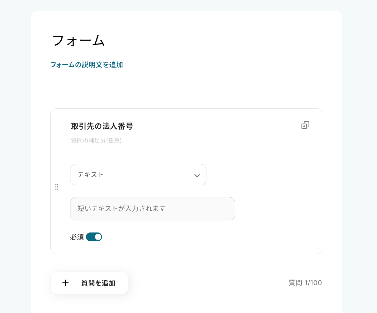 - フォームトリガー機能では、法人番号や会社名など、法人情報の取得に必要な情報を入力してもらうための項目を任意で設定してください。