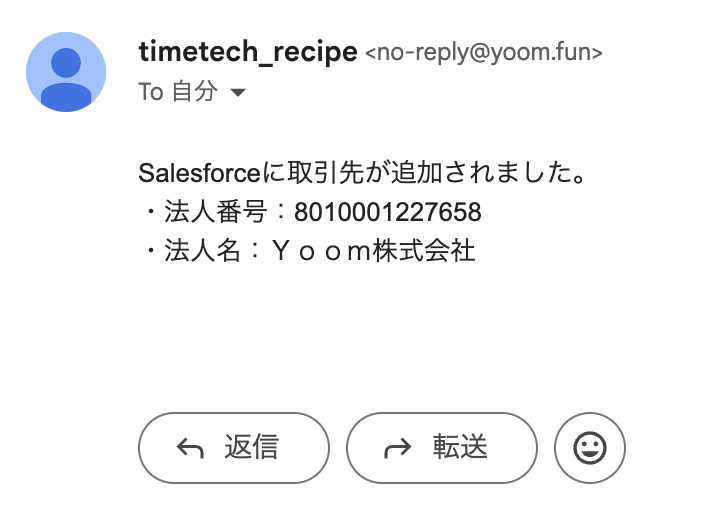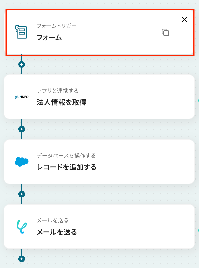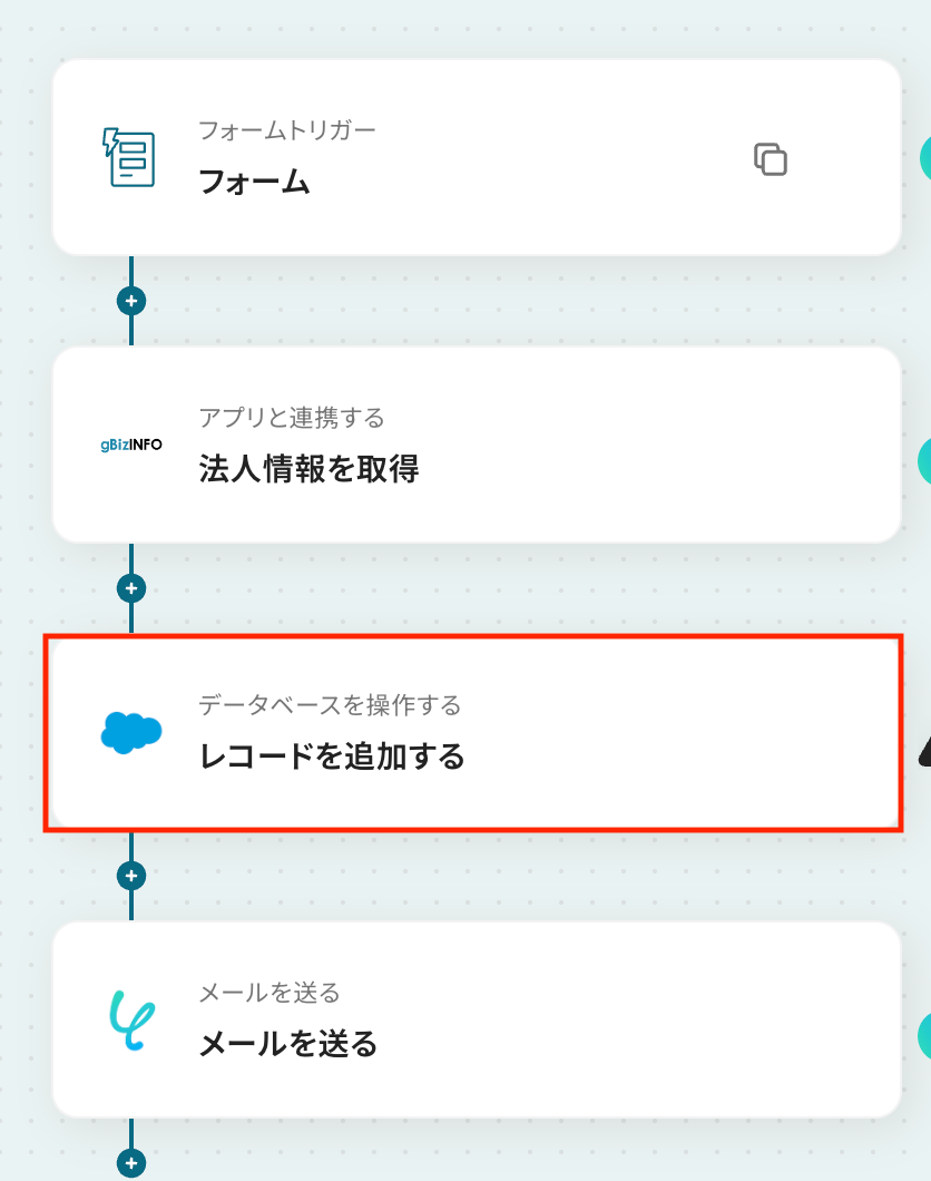 - フォーム回答をトリガーに、gBizINFO(経済産業省)での法人情報取得からSalesforceへの登録までが自動で実行されるため、情報収集や入力にかかる時間を短縮できます。