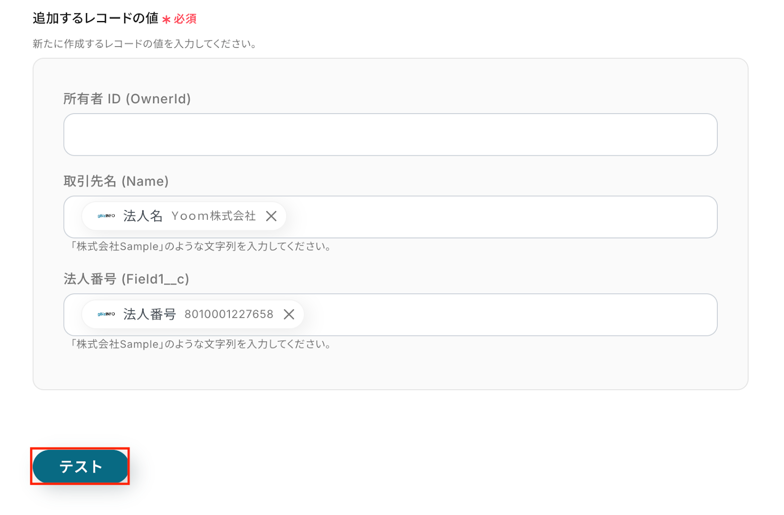 - Yoomデータベースに追加するレコードの内容は、固定値だけでなく、前段のオペレーションで取得した法人情報などを変数として活用し、自由に設定できます。
