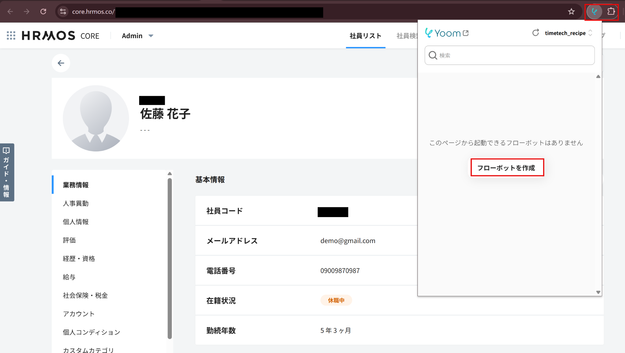 - HRMOSの社員詳細ページを開き、Chrome拡張機能を起動し、「フローボットの作成」をクリックしましょう。