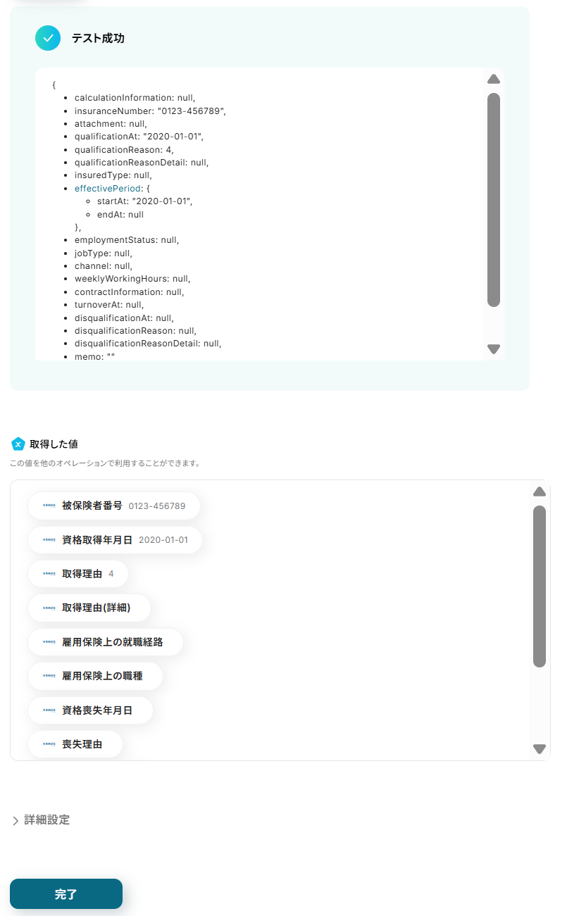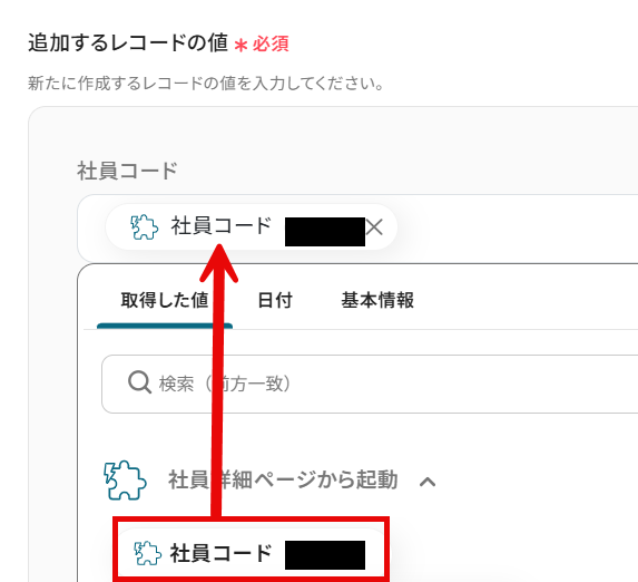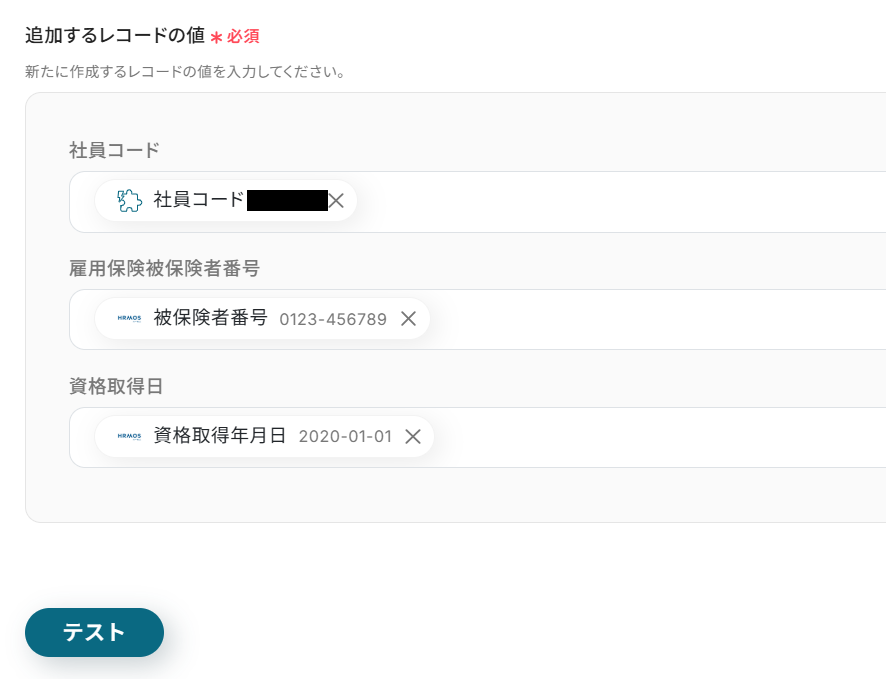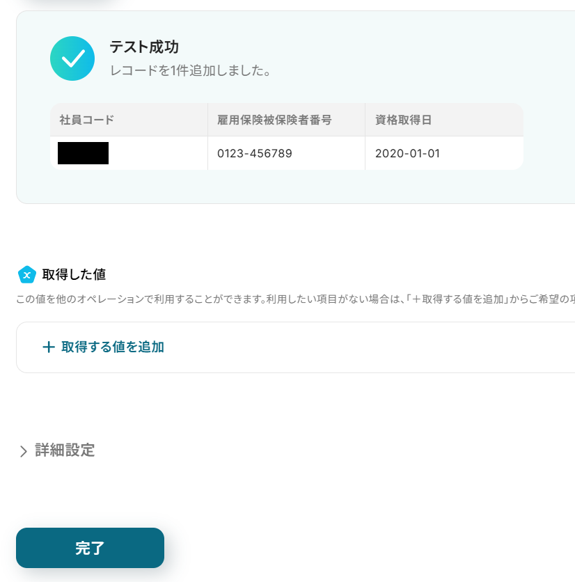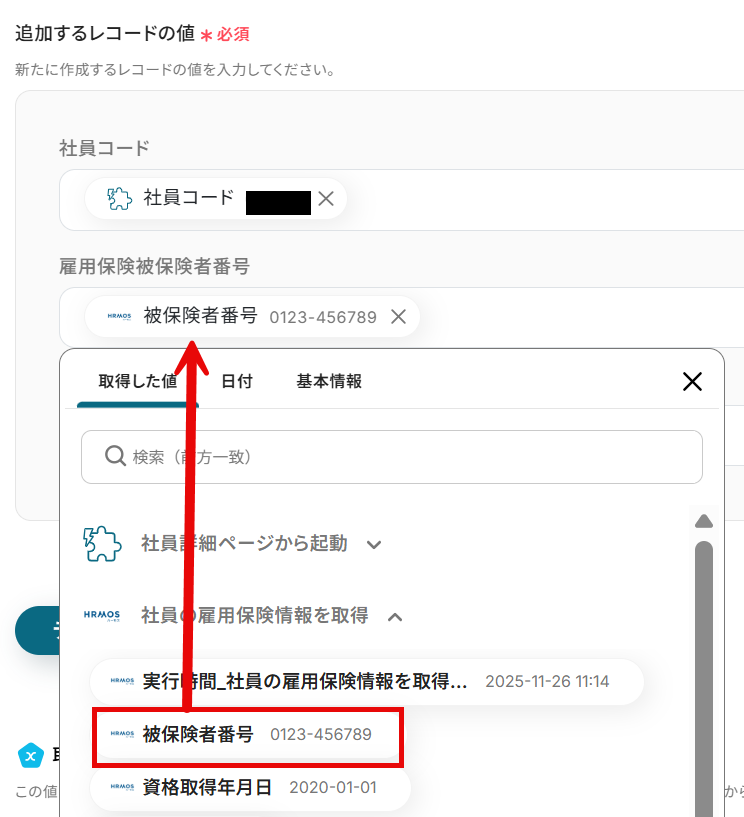 今回は「社員コード」「雇用保険被保険者番号」「資格取得日」を、それぞれ取得した値から選択します。