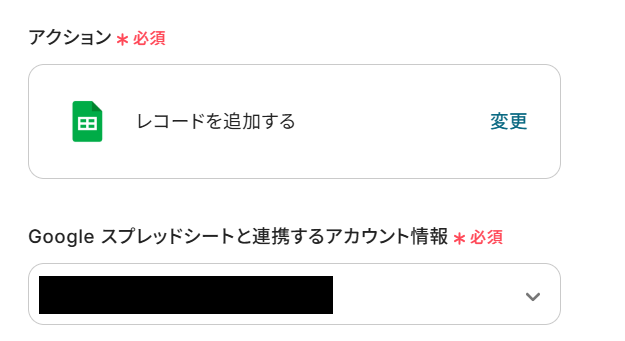 - 最後に、オペレーションでGoogle スプレッドシートの「レコードを追加する」アクションを設定し、取得した情報を指定のシートに追加します。