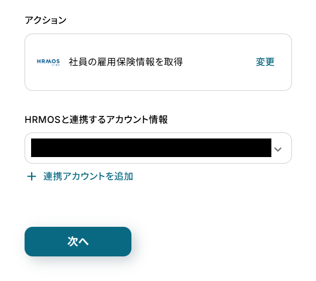 - 次に、オペレーションでHRMOSの「社員の雇用保険情報を取得」アクションを設定します。