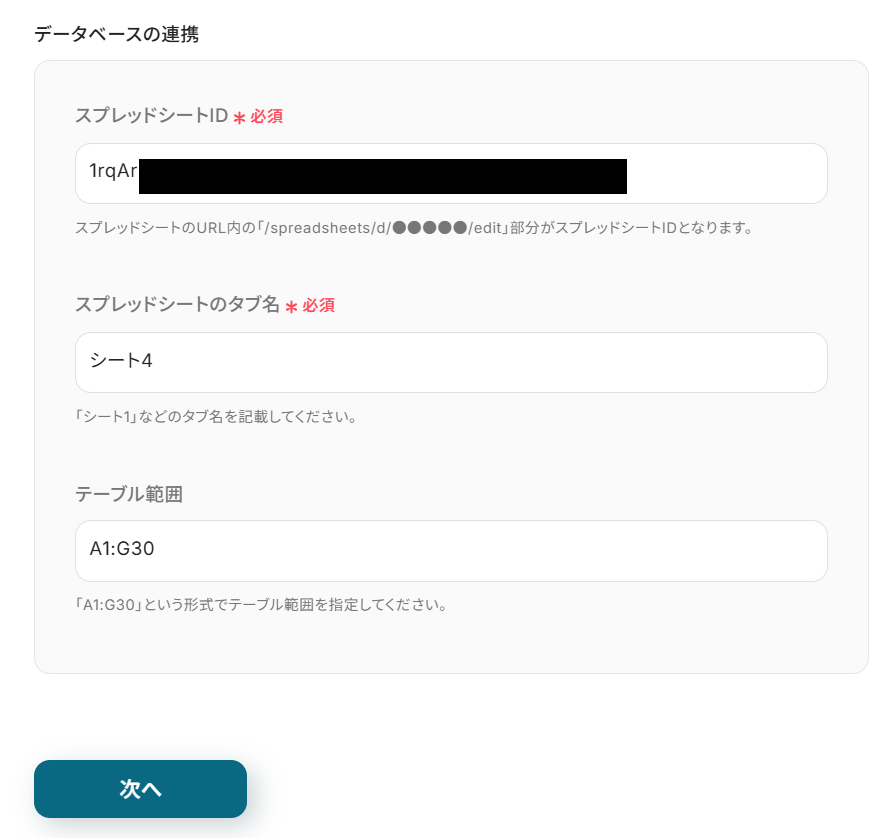 - Google スプレッドシートの設定では、情報を追加したい任意のスプレッドシートIDやシート名を設定してください。