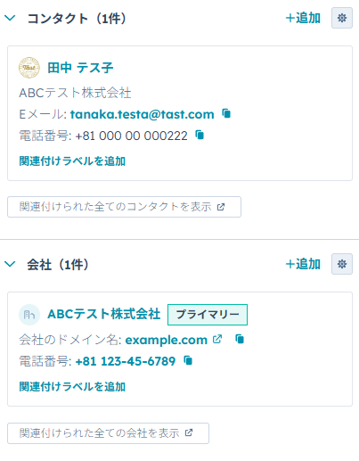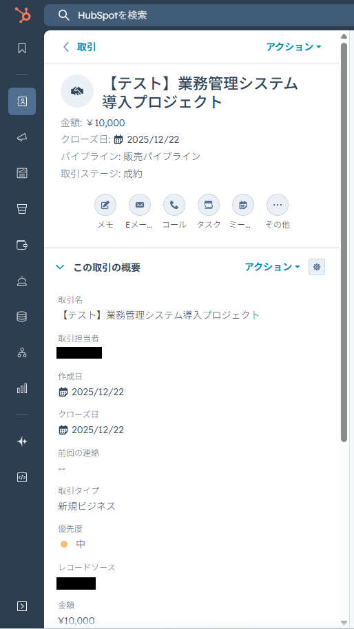 ここで、テスト操作の準備を行います。 今回のフローでは、取引とそれに関連するコンタクト&会社情報を活用するので、実際にHubSpotで作成してみましょう。 作成する内容は、架空の情報(「テスト会社」や「テスト商談」など)でOKです。