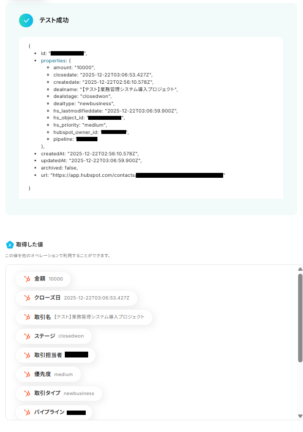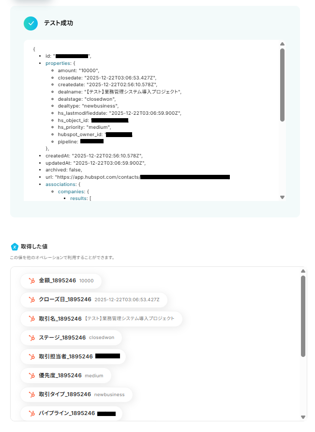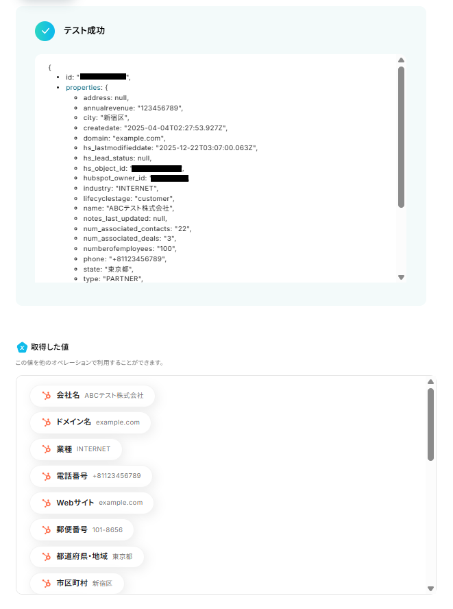 テストが成功すると、下記のような取得した値が表示されます。 取得した値はこのあとの設定でも使用します。 ※取得した値 とは?