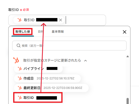 「取引ID」は、取得した値を引用し設定しましょう。 取得した値を引用することで、トリガーが実行されるたびに最新の値が反映されます。 設定が完了したら「テスト」を押してください。