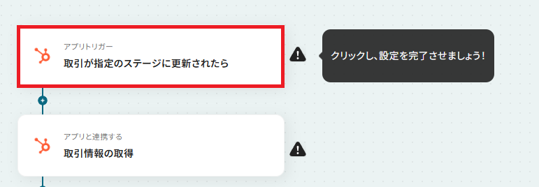 ステップ3:HubSpotのトリガー設定 ここからはフローボットの設定を進めていきます。 まず、「取引が指定のステージに更新されたら」をクリックしてください。