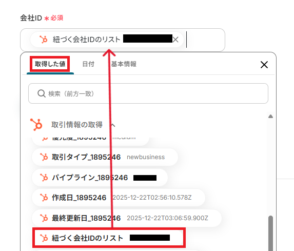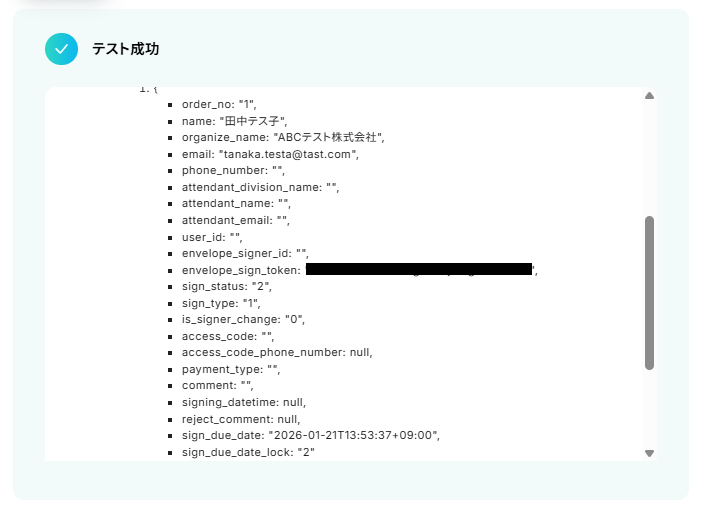 「会社ID」は、取得した値から『紐づく会社IDのリスト』を引用しましょう。 設定が完了したら「テスト」を押してください。