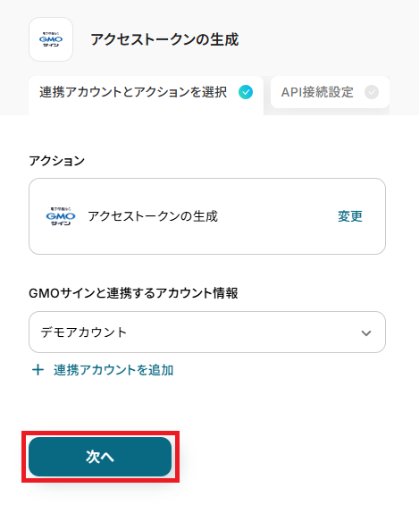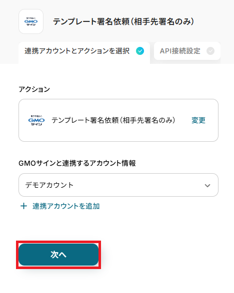 クリックすると以下の画面に切り替わります。 Yoomと連携するGMOサインのアカウントに間違いがないかを確認し、「次へ」をクリックしましょう。