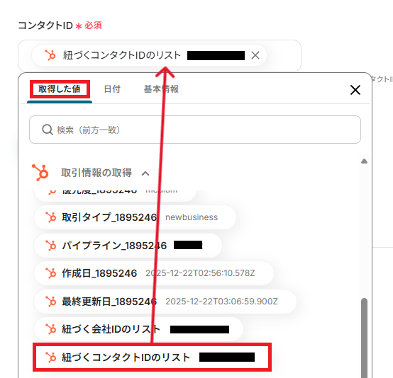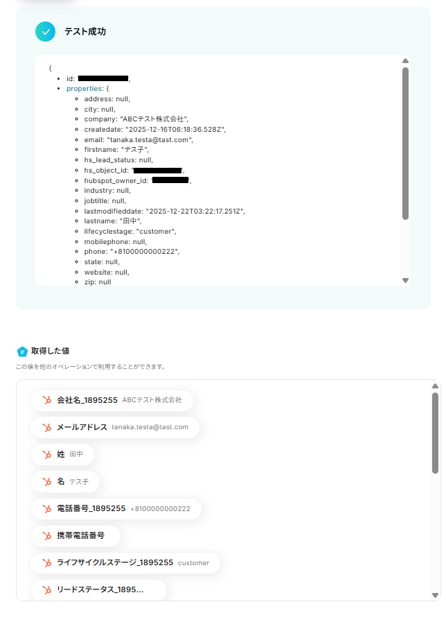 「コンタクトID」は、取得した値から『紐づくコンタクトIDのリスト』を引用しましょう。 設定が完了したら「テスト」を押してください。