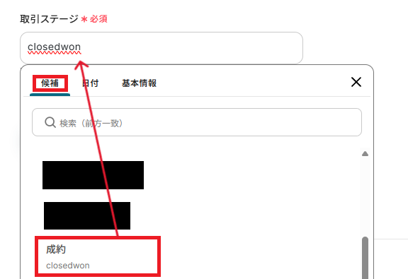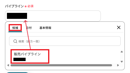「パイプライン」は、作成した取引内容を確認し、入力欄をクリックして表示される候補から選択してください。 候補は、連携しているアカウントに紐づいて表示されます。