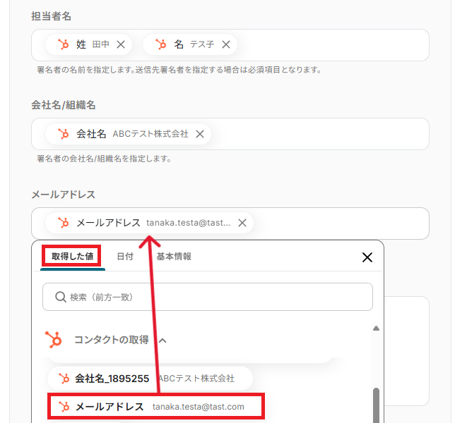 次に、送信先署名者情報を設定します。 「担当者名」「会社名/組織名」「メールアドレス」は、HubSpotで取得した値を引用し、それぞれ設定しましょう。
