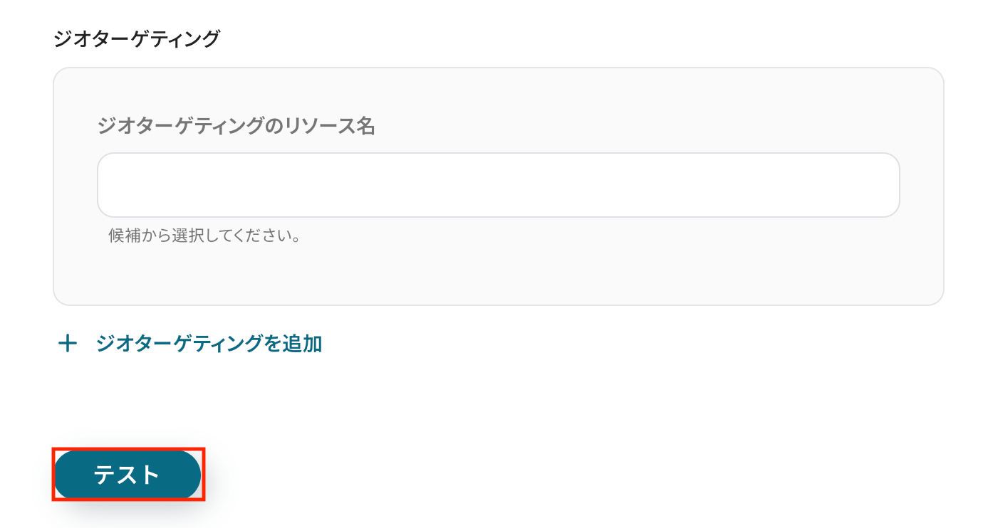 入力が完了したら、設定内容とトリガーの動作を確認するため「テスト」をクリックします。 テストがうまくいかない場合などは、以下のヘルプページも参考にしてみてください。【アプリトリガー】Google スプレッドシートのトリガーにおける注意事項
