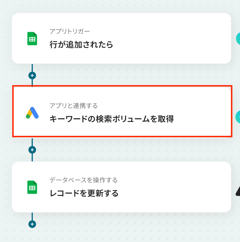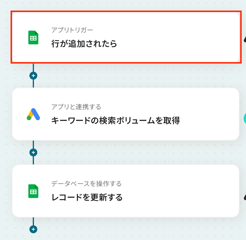 トリガーとなるGoogle スプレッドシートの設定では、対象のスプレッドシート、シート、キーワードが入力される列などのテーブル範囲を任意で指定してください Google Adsで検索ボリュームを取得するアクションでは、対象の広告アカウントIDや、どのセルの値をキーワードとして参照するかを任意で設定可能です 取得した検索ボリュームを書き戻すGoogle スプレッドシートのアクションでは、対象のスプレッドシートやシート、更新したいセル(列)を任意で指定してください ■注意事項