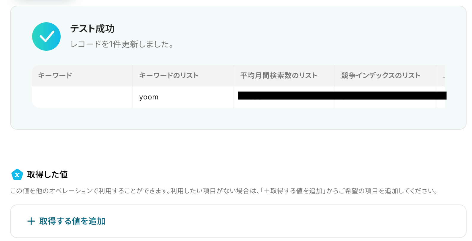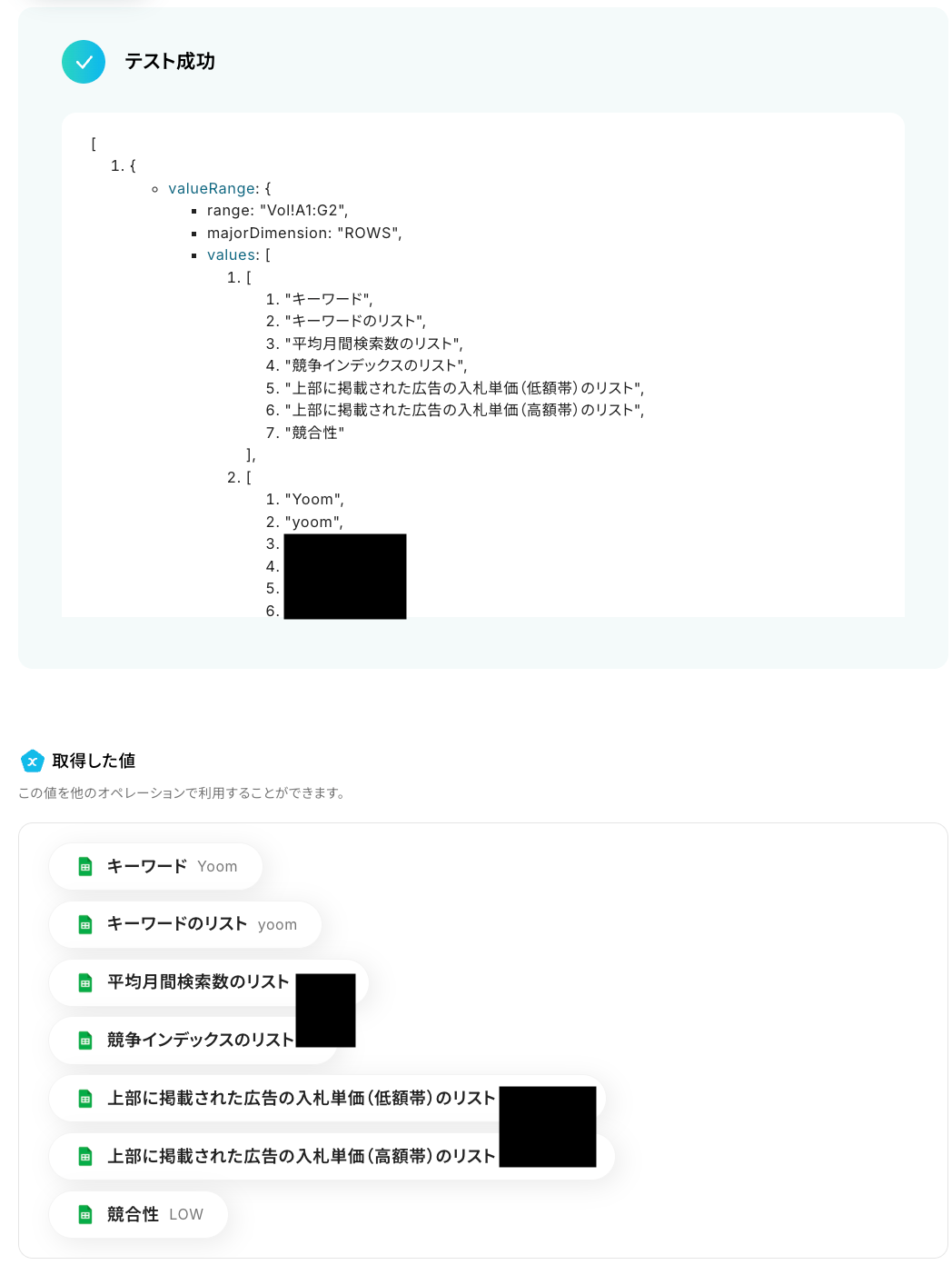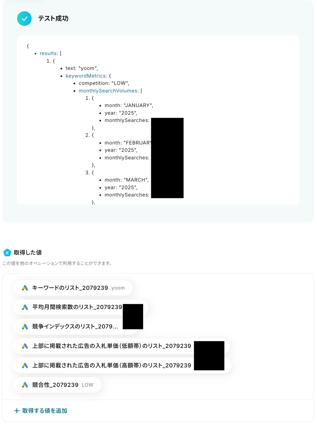 テストに成功すると、Google Adsから取得されたキーワードの検索ボリュームに関する情報が表示されます。 以下の取得した値はこの後のステップで利用できます。
