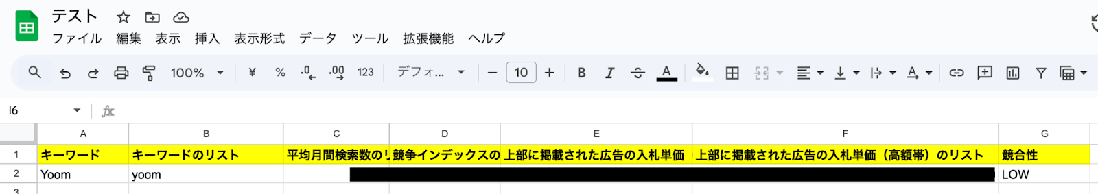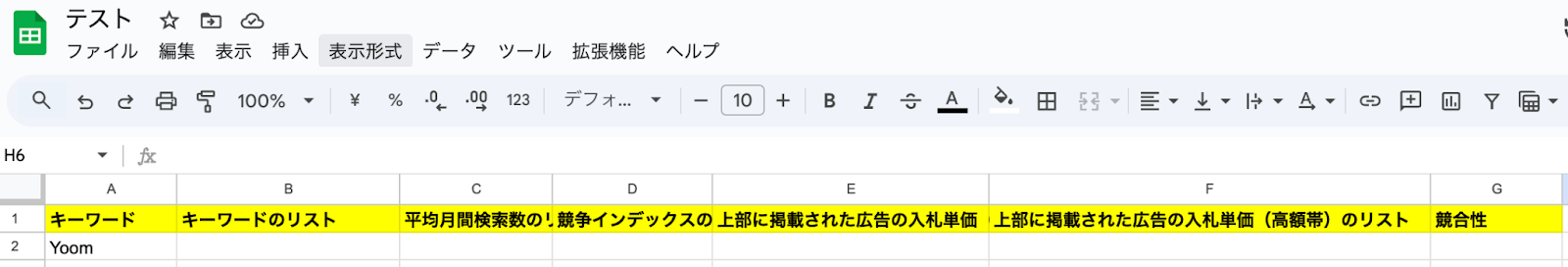 実際にGoogle スプレッドシートへキーワードを追加し、検索ボリュームが正しく反映されるかを確認してみましょう。