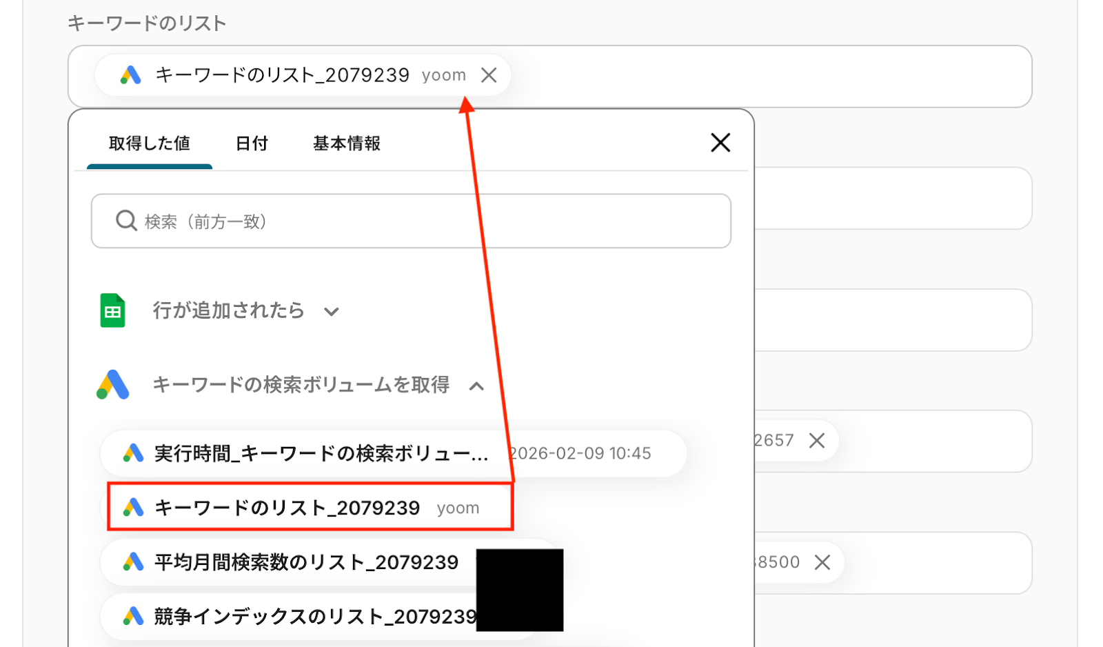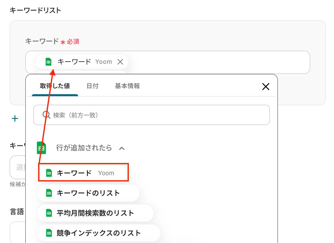 キーワードリスト 入力欄をクリックすると、前のステップでGoogle スプレッドシートから取得した値が表示されるので、選択して入力しましょう。 取得した値を活用することで値が固定化されず、フローボットを起動するたびに最新の情報を自動で反映できます。 なお、テキストを直接入力した部分は固定値となります。 そのため取得した値を活用せず設定を行うと、毎回同じキーワードの検索ボリュームがGoogle Adsで取得されてしまうので注意が必要です。