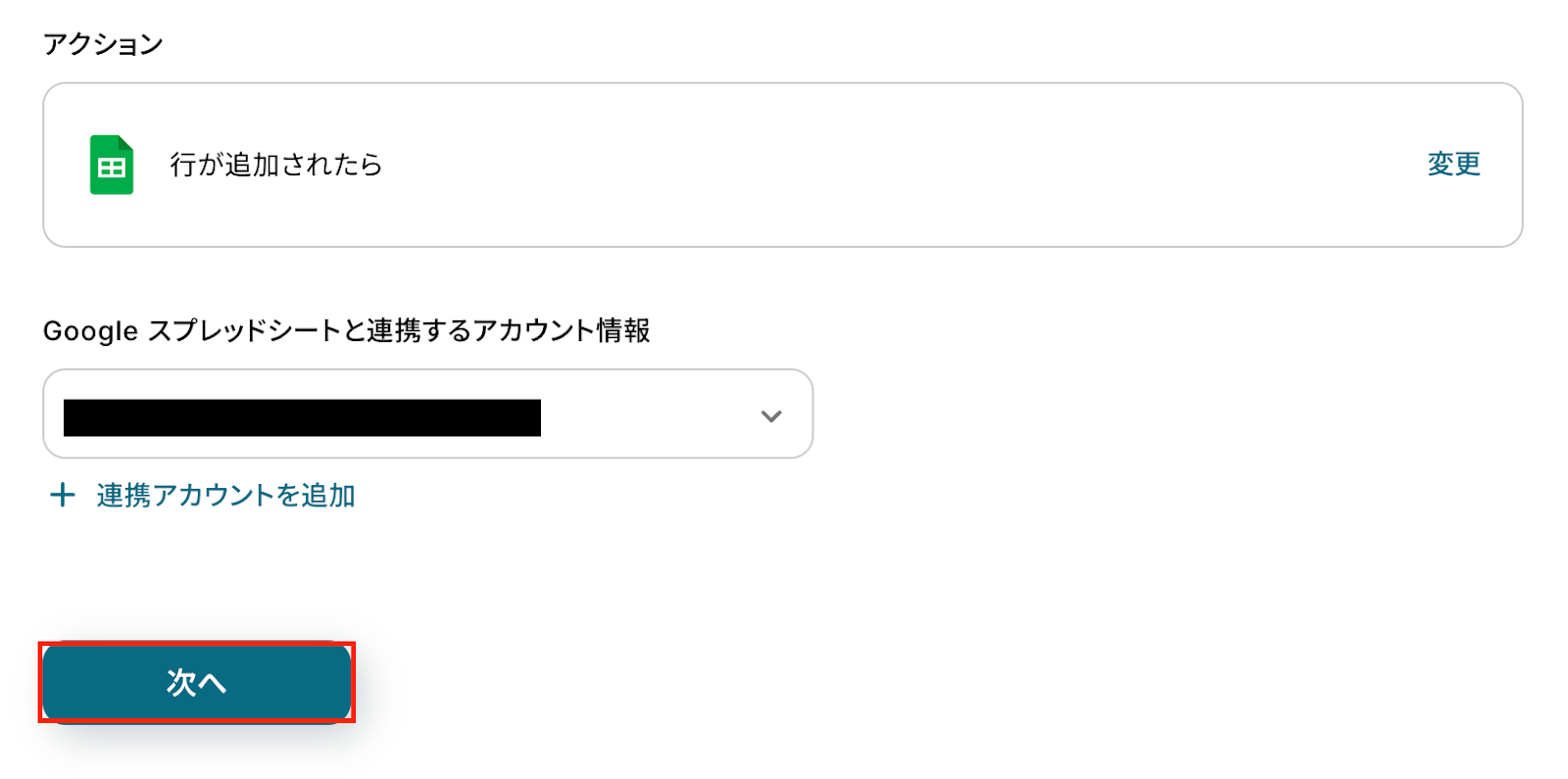 アクションはあらかじめ設定されているため、そのまま内容を確認してください。 Google スプレッドシートと連携するアカウント情報に問題がなければ、「次へ」をクリックします。