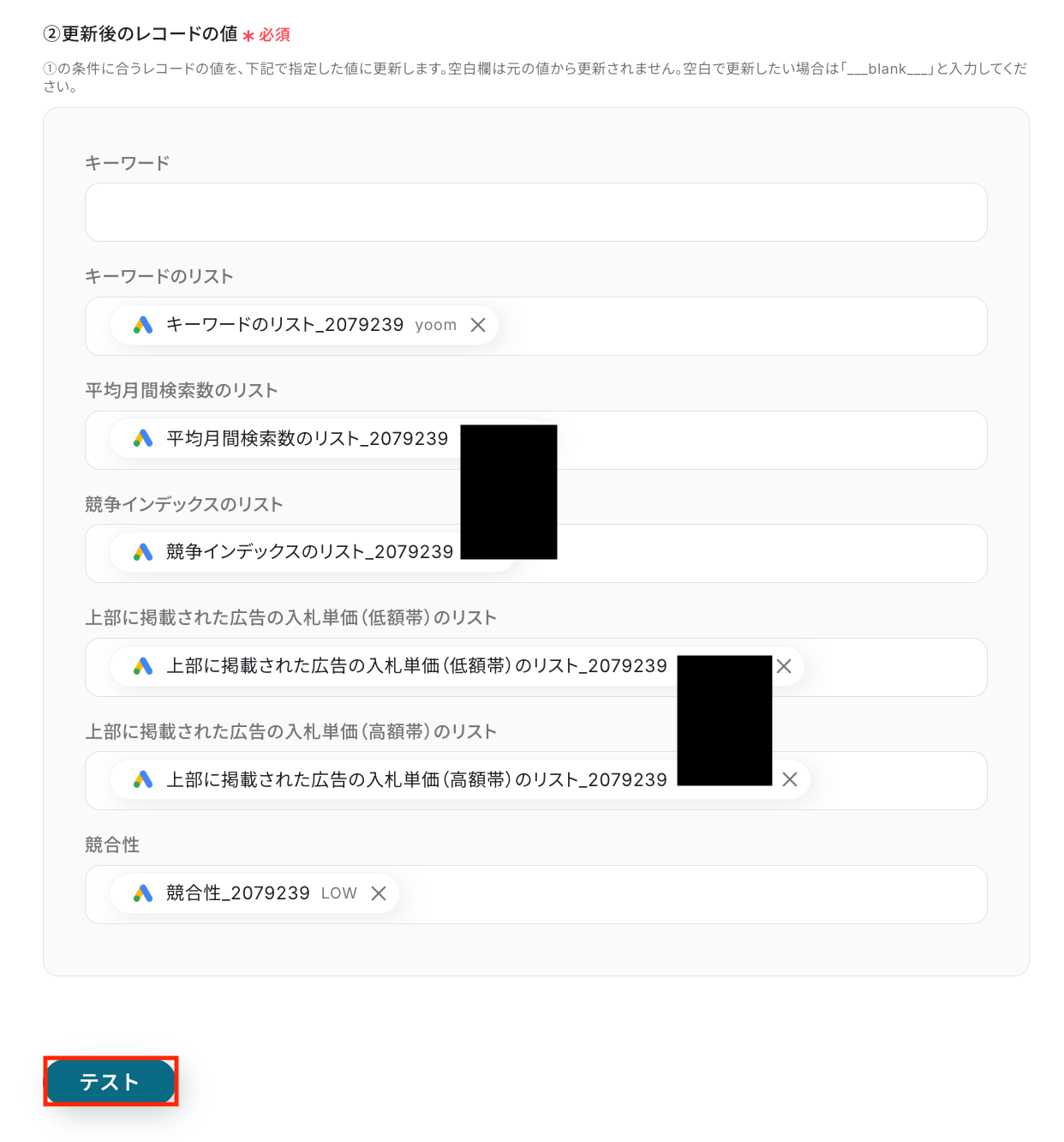 それぞれの項目について入力が完了したら、「テスト」をクリックして、設定した内容でGoogle スプレッドシートでレコードが更新されるか確認しましょう。