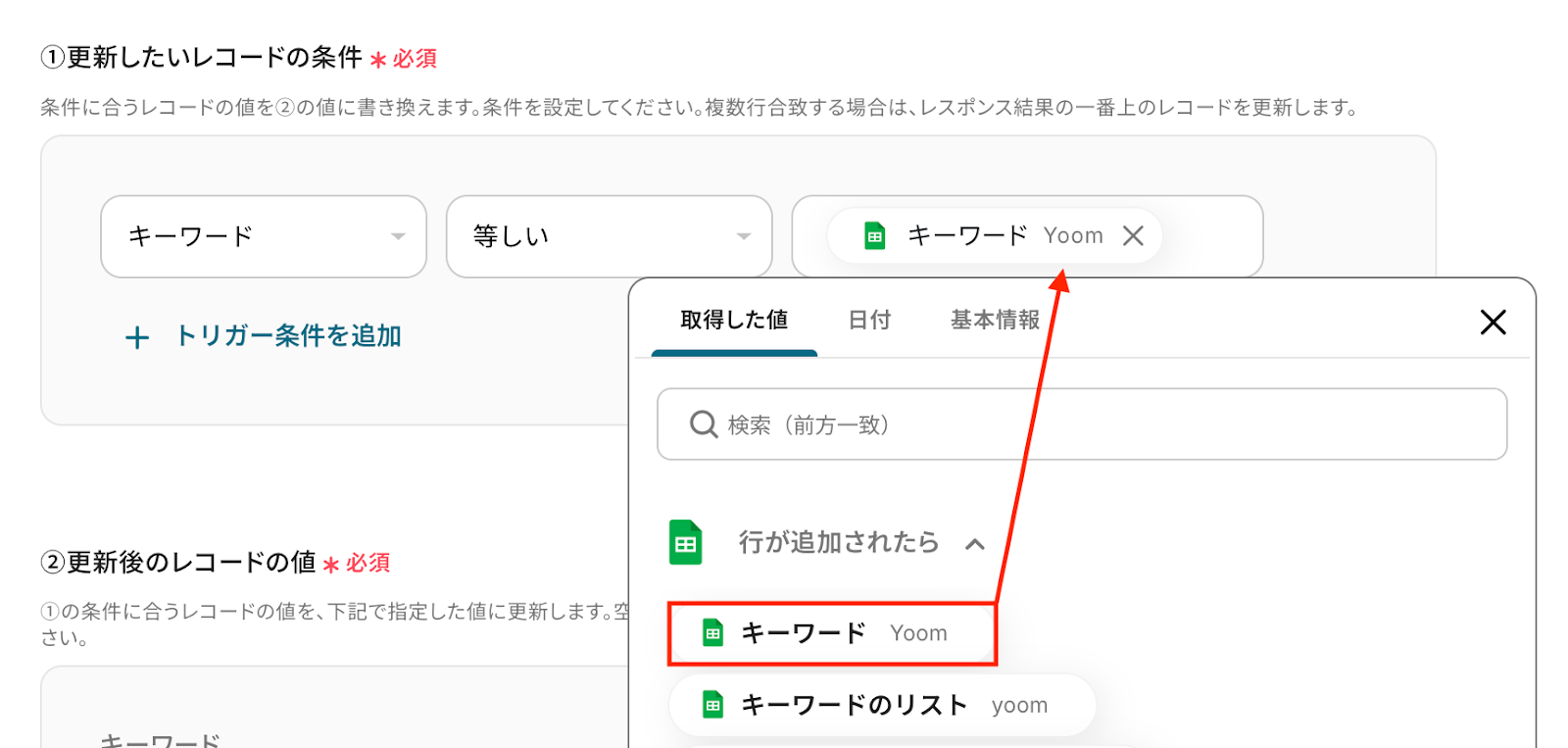 更新したいレコードの条件 更新対象となる行を指定します。今回は、Google スプレッドシートA列の「キーワード」が前のステップで取得した値(Yoom)と一致する行を条件として設定しました。これにより、該当するキーワードの行のみが更新されます。