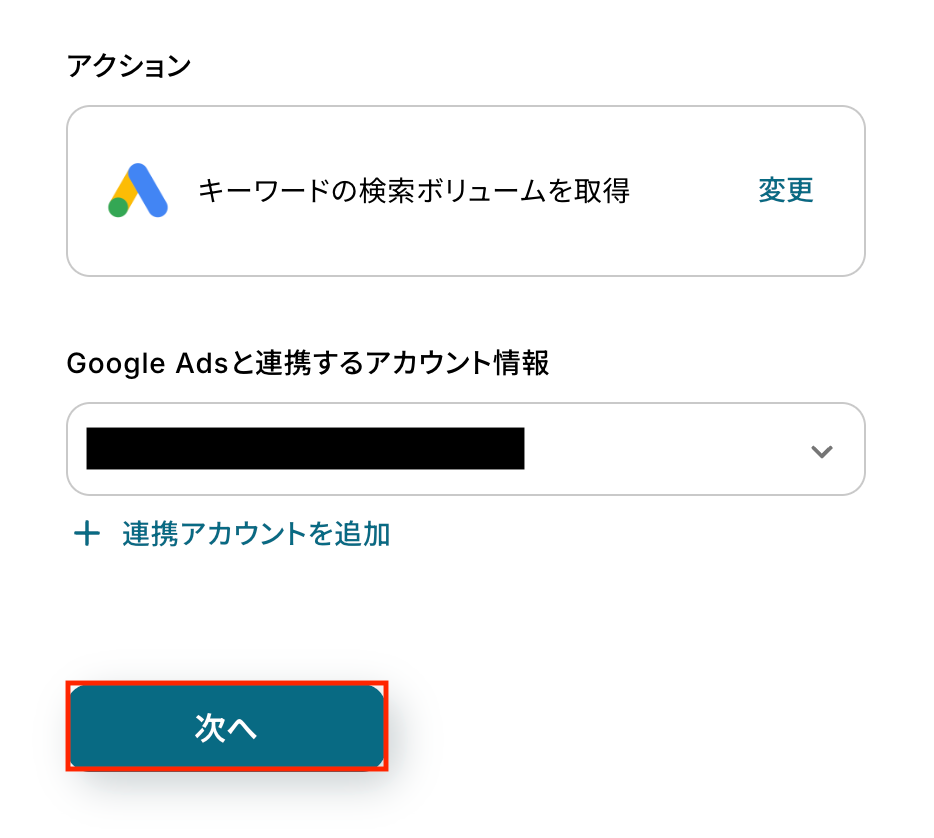 アクションはあらかじめ設定されているため、そのまま内容を確認してください。 Google Adsと連携するアカウント情報に問題がなければ、「次へ」をクリックします。
