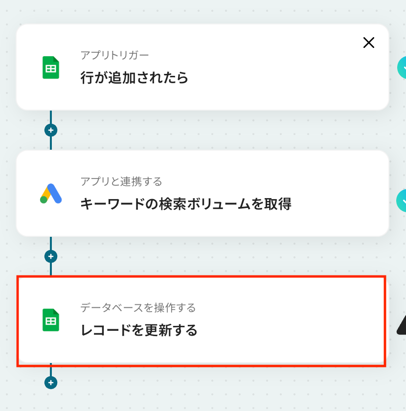 ステップ5:Google スプレッドシートでレコードを更新する いよいよ最後の設定です! 前のステップでGoogle Adsから取得した値を利用して、Google スプレッドシートのレコードを更新しましょう。